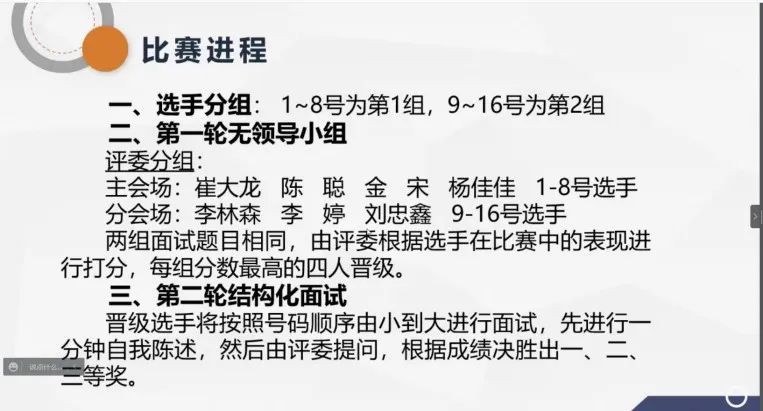 经过无领导小组面试环节后,朱力东、叶岩、吴慧琳等8位选手成功晋级第二轮比赛环节——结构化面试。在本环节中,选手们分别从学习与科研经历、实习经验、学生工作经历和求职意向等多方面进行自我评述,针对应聘岗位分析自我优势。评委老师提问过程中,选手沉着冷静、对答如流,展现北科学子风采。