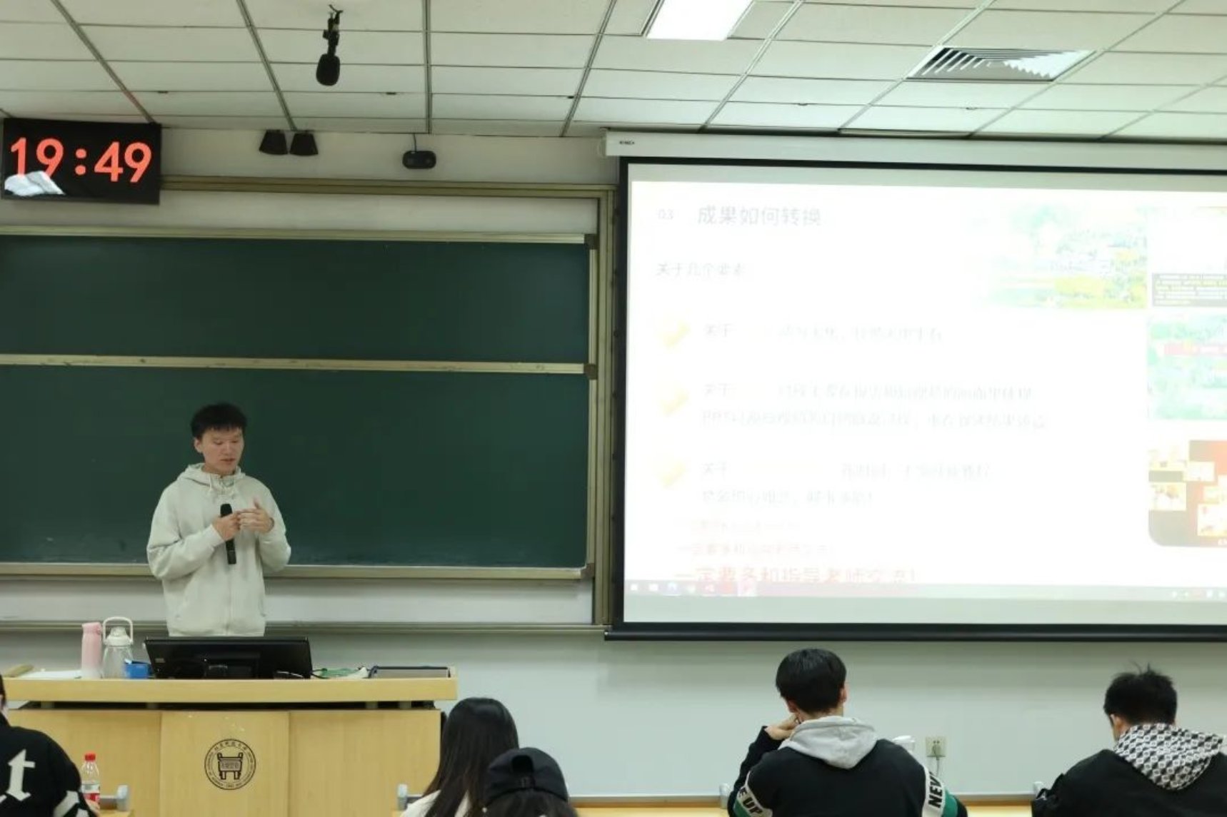 刘鹏学长首先向我们介绍了自己丰富的科研竞赛经历,再从项目的来源方面向我们讲述了寻找课题方向的分析方法,在赛前要做好丰富的调研和准备。此外,他还提到,充足的准备是事情成功的重要基石。在备赛的过程中要注意比赛报名截止的时间,提交材料的撰写,以及答辩PPT的制作等细节问题。