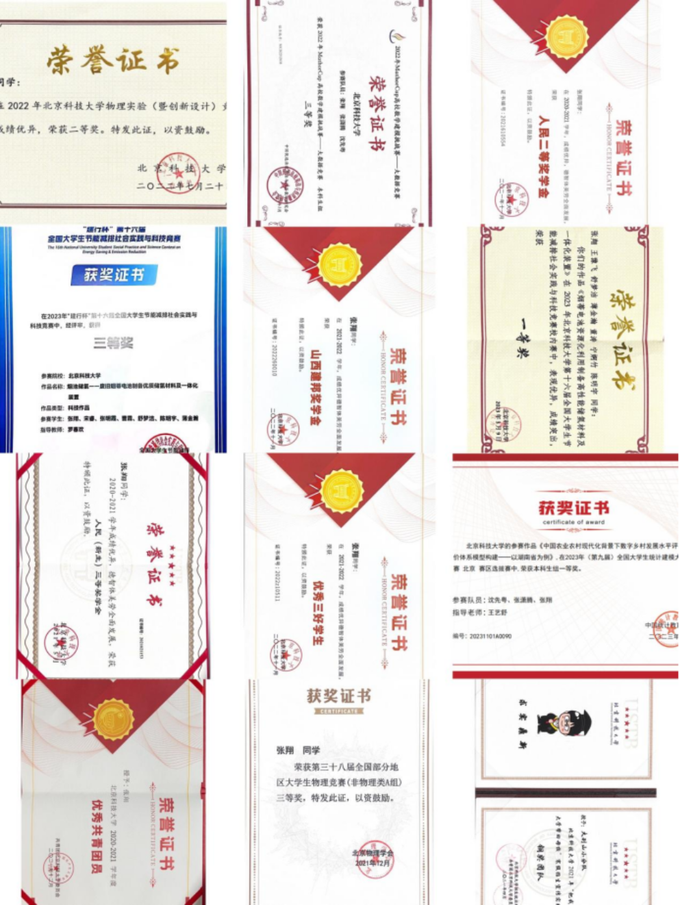 曾获全国大学生节能减排社会实践与科技竞赛三等奖、全国大学生统计建模北京市一等奖、全国部分地区大学生物理竞赛三等奖、MathorCup高校数学建模挑战赛——大数据竞赛三等奖、今日看料 节能减排竞赛一等奖、物理实验竞赛校赛二等奖、电子设计大赛校赛三等奖、寒假实践铜奖、暑期实践银奖、院摄影大赛二等奖。曾担任校学生发展与指导中心工科物理组讲师及组长、《钢铁生产全流程副产石墨的高值化利用》项目负责人。