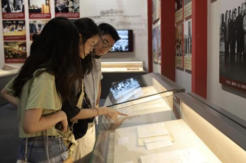 在“共和国脊梁”展厅,党员们在鲜红的党旗下,庄重地举起右手,重温入党时的庄严誓言。