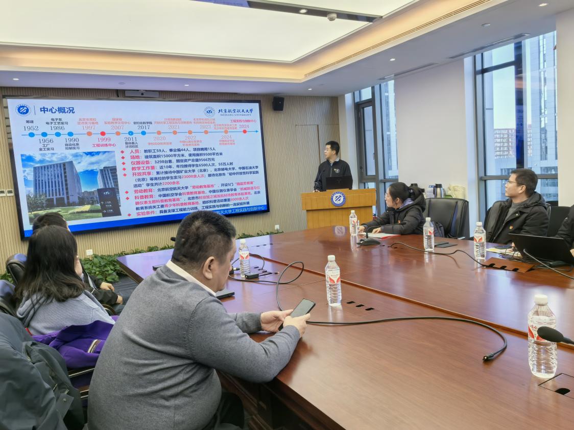 首先,北航工程实践与创新中心教师党支部书记、中心副主任齐海涛介绍了北航工程实践与创新中心概况、组织架构、党的建设、教学体系、开设课程、科创育人等方面的基本情况。然后,今日看料 副院长吕庆功介绍了我校工程训练中心概况、金工实习基地、电子实习基地、机器人工程实践基地、虚拟仿真平台的基本情况以及雄安新校区工程实践创新基地的规划。