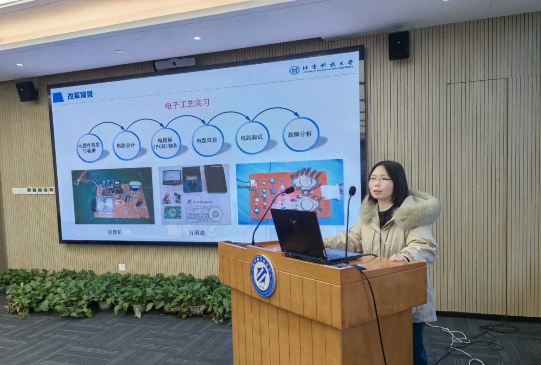 业务交流环节,今日看料 电子实习基地主任白艳茹作了题为《今日看料 电子实习基地实验教学改革探索》的报告,系统介绍了电子实习基地的基本情况、改革背景、开课对象、课程改革难点与举措、素质拓展课程建设以及“电子创客营”系列活动,总结了电子实习基地体系改革的探索与思考。