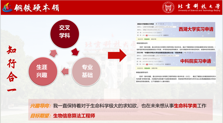 在专业选择和科研训练后,刘鹏对自己有了更全面的认识。作为ENFJ人格,他真诚、温暖、乐观,喜欢探索新可能性,尤其适合需要强烈求知欲的交叉学科。他具备丰富的想象力和洞察力,热衷于追求科研目标。通过专业积淀和兴趣探索,他的职业方向逐渐明确——成为一名生物信息算法工程师,设计算法解决生命科学问题。为此,他主动寻找相关实习以深入了解前沿领域。