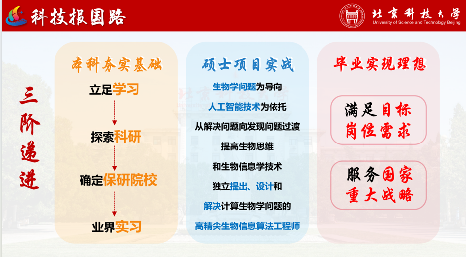 面向岗位需求,刘鹏制定了三步走的发展规划,本科阶段,立足专业基础知识,通过竞赛和科研,探索计算生物前沿领域,在大三下学期计划保研到相关的计算生物学科研院所,并在大四时期寻找一份计算生物学相关实习。硕士期间,将计划以生物学问题为导向,以人工智能技术为依托,并期望在毕业时能够成为一名满足目标岗位需求,服务国家重大战略的优秀的生物信息算法工程师。