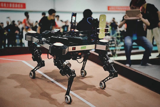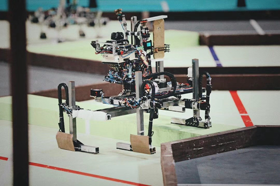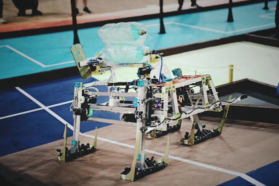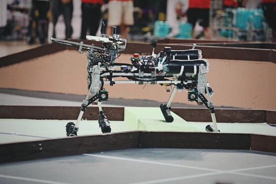 作为今年赛事的亮点和技术难点,各校四足机器人精彩表现夺得观众们的一片叫好。MEI的小短腿“柯基”机器人全程依靠激光雷达扫描场地内三根柱子,辅以视觉对机器人进行定位;行走机构则通过物理模型分析估算落地各时间点各腿应该在的位置模拟柔性控制。遗憾的是,在总决赛小组循环赛的过程中,由于在四足机器人上坡时传感器出现故障,又后续出现路线偏移失误,未能实现有效登顶,止步三十二强。